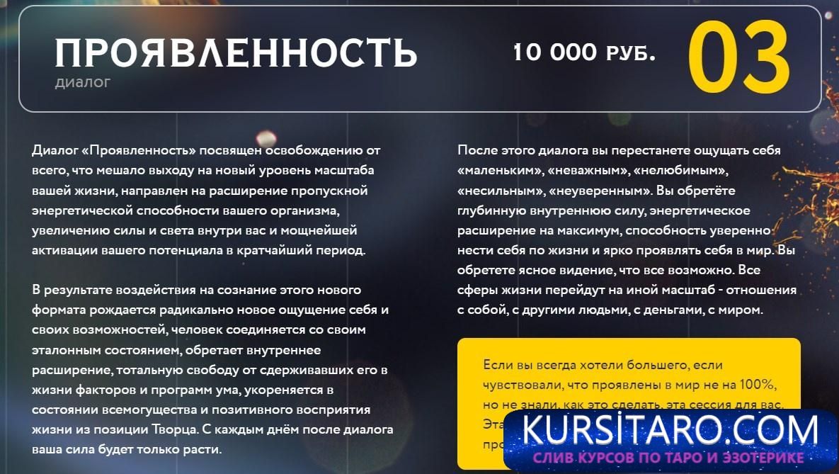 Диалог «Проявленность» посвящен освобождению от всего, что мешало выходу на новый уровень масштаба вашей жизни, направлен на расширение пропускной энергетической способности вашего организма, увеличению силы и света внутри вас и мощнейшей активации вашего потенциала в кратчайший период.