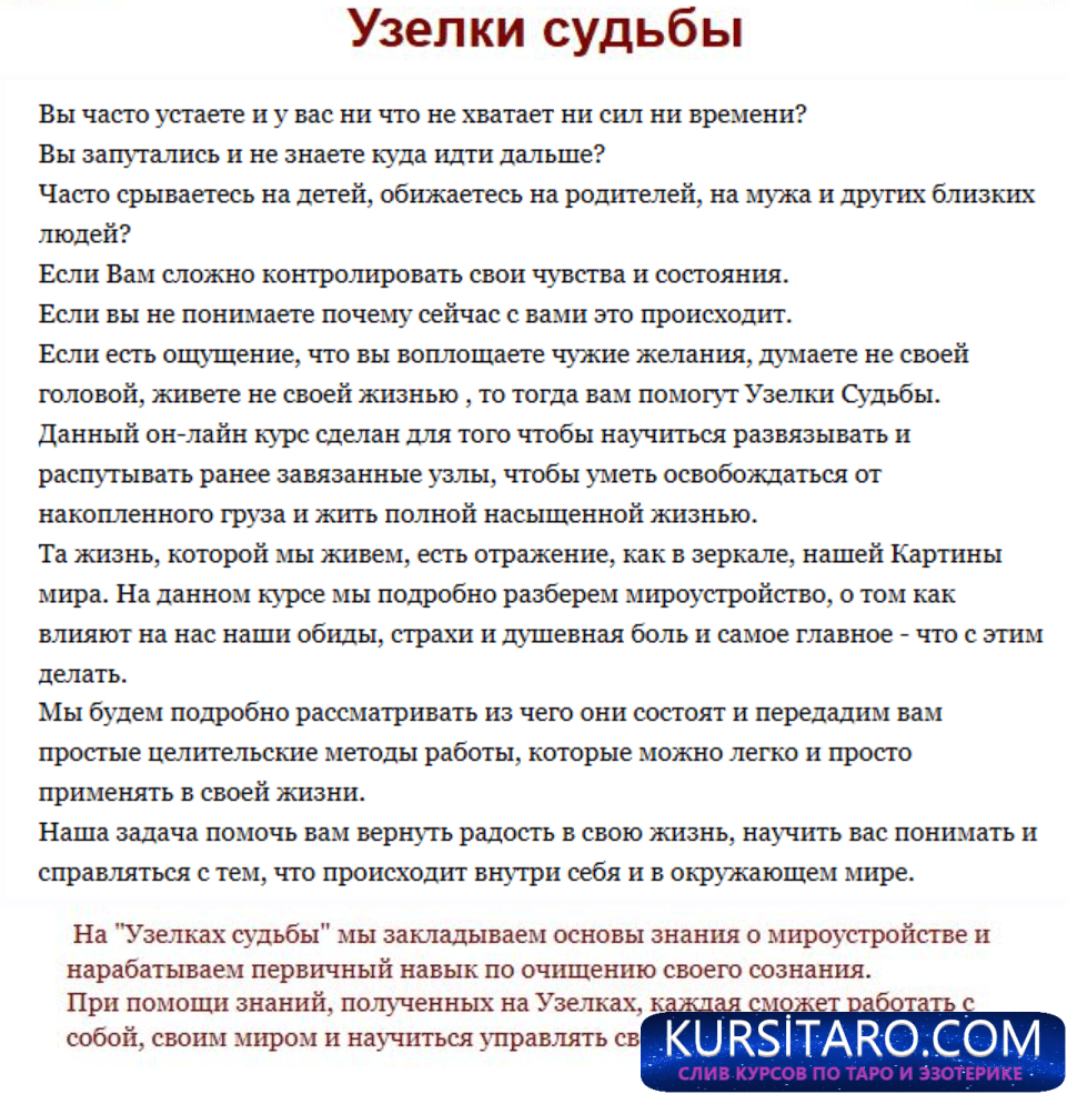 На "Узелках судьбы" мы закладываем основы знания об очищении и нарабатываем первичный навык, такой, с которым можно приступить к очищению. Мы изучаем практики очищения себя от боли, обид, страхов и других болезненных состояний, мешающих полноценно решать свои задачи и просто быть счастливыми.