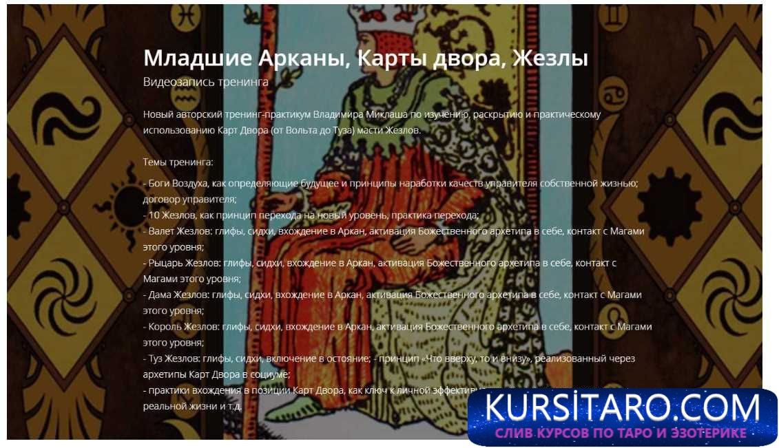 Новый авторский тренинг-практикум Владимира Миклаша по изучению, раскрытию и практическому использованию Карт Двора (от Вольта до Туза) масти Жезлов.