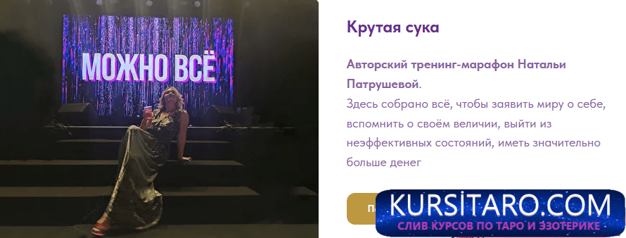 «Крутая сука» — авторский курс Натальи Патрушевой для тех, кто потерял контакт с собой и телом, устал от удобности, посредственности, неэффективных отношений и безденежья, забыл ощущение счастья и лёгкости.